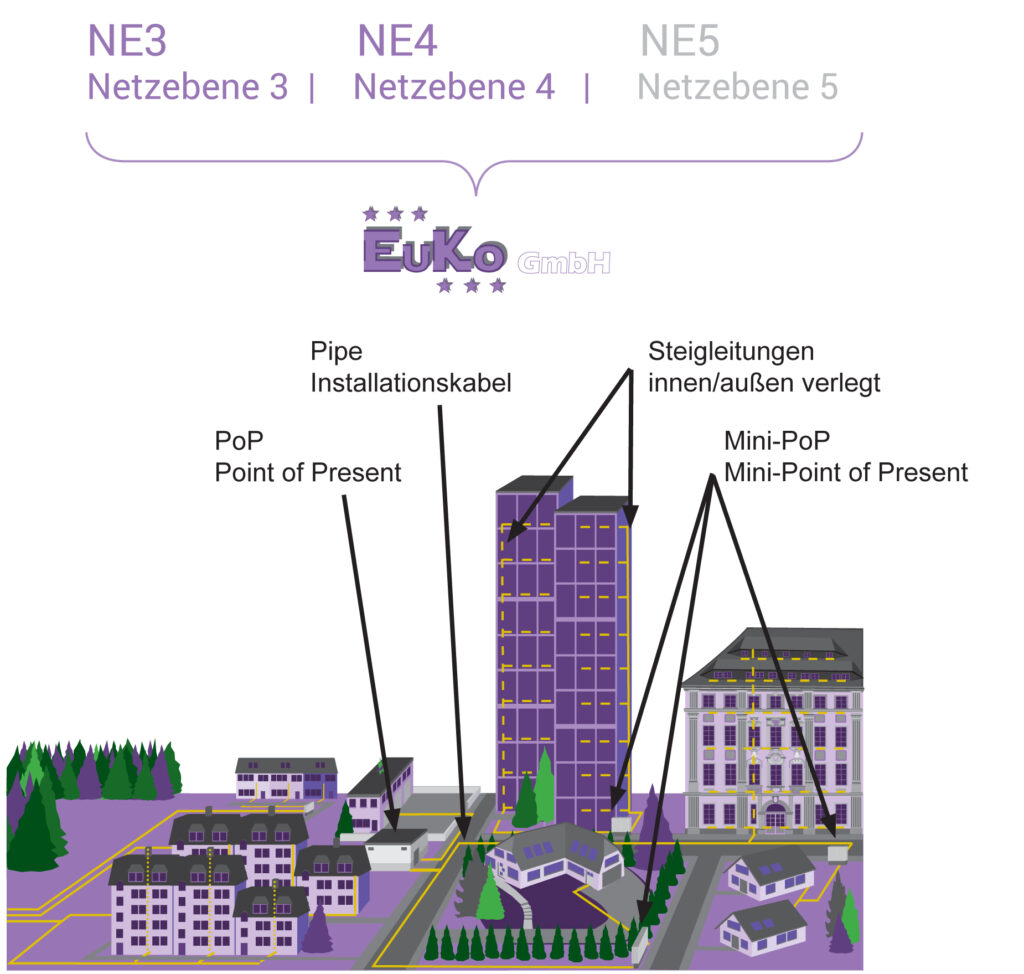 Für uns als EuKo GmbH ist jedoch erst die Netzebenen 3 und 4 (NE3 und NE4) aber auch die Netzebene 5 (NE5) richtig interessant und relevant. So ist die Netzebene 3 (NE3) der Abschnitt zwischen Haupt- oder Nebenverteilerzentren, also dem Lokalen „Point-of-Present“ (PoP) der die Netzebene 3 (NE3) darstellt, die meist kleine eher unscheinbare Häuschen etwa von der Größe eine Garage sind, in denen die lokale Verteilung stattfindet. Das heißt entweder direkt zu dir nach Hause an den Hausübergabepunkt (HüP) was die  die Netzebene 4 (NE4) dann darstellt. Oder über einen noch vorgeschalteten „Mini-Point-of-Present“ (Mini-PoP), das was du als grauen Kasten verschiedener Provider auf der Straße sicher schon mal bewusst oder unbewusst gesehen hast.